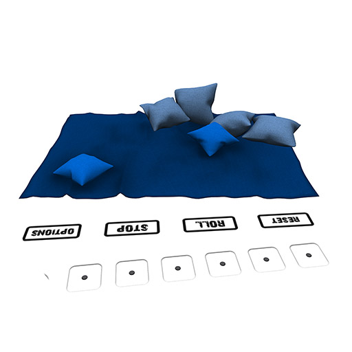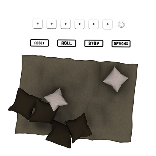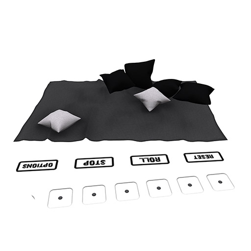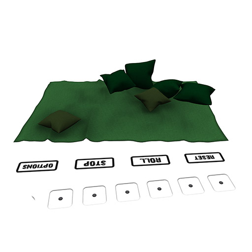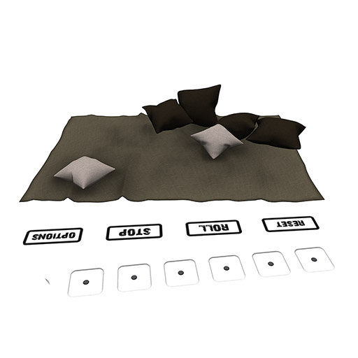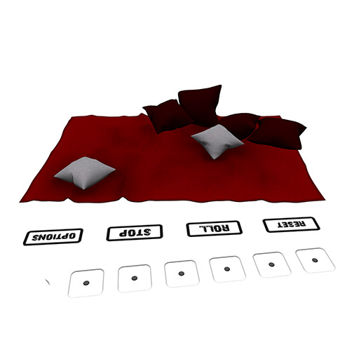 The table has the option to enable Amish or Zilch rules, also there is the possibility of using Joker Dice. Coloring of pillows and rug can be changed via menu ("Brown Shades", "Blue Shades", "Red Shades", "Yellow Shades", "Green Shades" or "Black and White"). It is possible to change both the button color (black/white) and the scoreboard color (black/white) to guarantee good readability on all surfaces. An option to disable instructional comments in local chat has been included to reduce chat spam for advanced users. Sounds can be turned on and off.