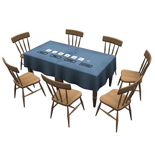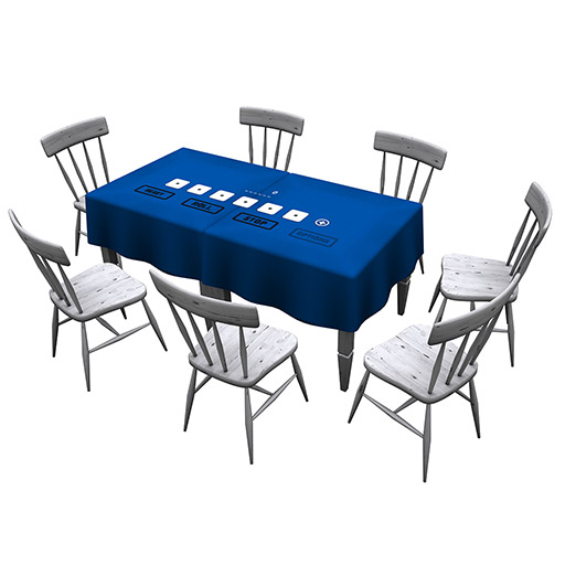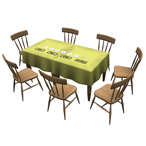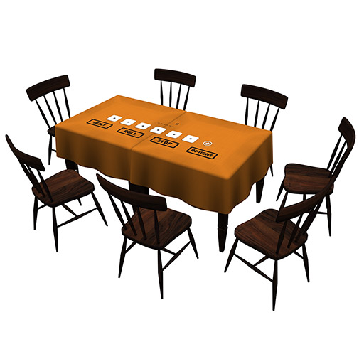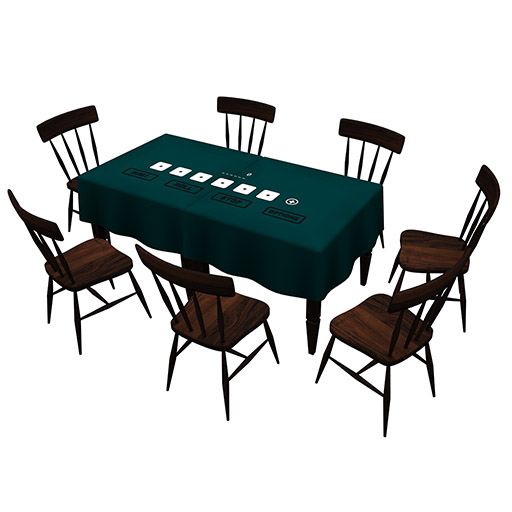 The table has the option to enable Amish or Zilch rules, also there is the possibility of using Joker Dice. Coloring of table cloth ("White", "Black", "Bordeaux", "Blue", "Orange", "Yellow", "Teal", "Light Blue", "Rose", "Lilac", "Beige", "Green Plaid") and texturing of chairs ("Light Wood", "Dark Wood", "White Wood") can be changed via menu. It is possible to change both the button color (black/white) and the scoreboard color (black/white) to guarantee good readability on all surfaces. An option to disable instructional comments in local chat has been included to reduce chat spam for advanced users.