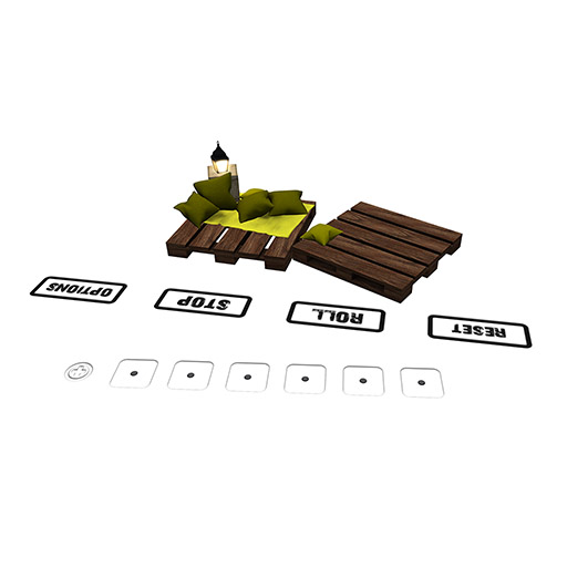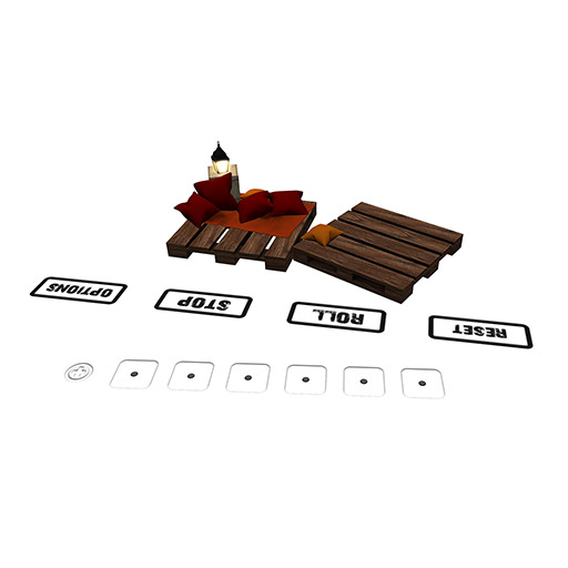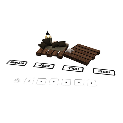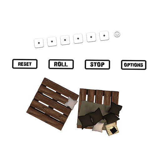 The table has the option to enable Amish or Zilch rules, also there is the possibility of using Joker Dice. The lantern can be turned on and off on touch. Coloring of pillows and rug can be changed via menu ("Brown Shades", "Blue Shades", "Orange Shades", "Yellow Shades", "Green Shades" or "Black and White"). It is possible to change both the button color (black/white) and the scoreboard color (black/white) to guarantee good readability on all surfaces. An option to disable instructional comments in local chat has been included to reduce chat spam for advanced users. Sounds can be turned on and off.